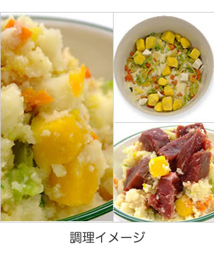 ダイエット中のフードのカサ増しとしてトッピングしたり、手作りベース食としてお好みの肉や魚などの動物性タンパク源と合わせて与えてください。