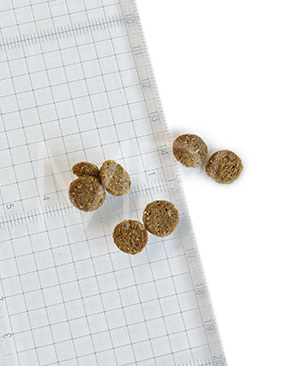 粗タンパク質 30.0%以上、粗脂肪 17.0%以上、粗繊維 4.0%以下、粗灰分 10.0%以下、水分 10.0%以下