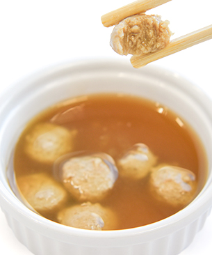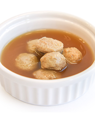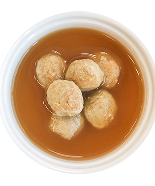 嗜好性の高いチキンを使用したミートボールを、猫や小型犬でも食べやすいサイズに仕上げました。スープにもチキンのうまみがたっぷり溶けています。