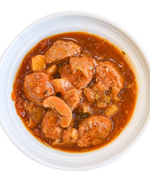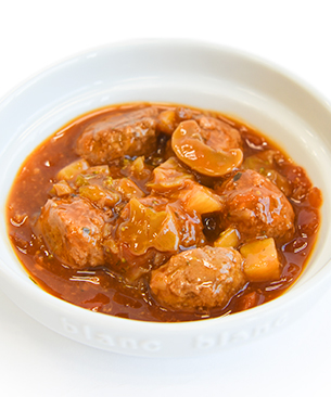 ごろっとしたビーフのミートボールと6種の野菜をトマトスープで煮込んだ、素材感たっぷりの犬猫用ウェットフード。