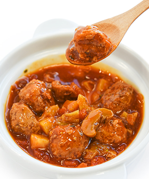 肉のうまみたっぷりなビーフを使用した少し大きめのミートボールは食べごたえ抜群。6種の野菜とトマトを一緒に煮込むことで、まるで「食べるスープ」のような具材感たっぷりのミートボール煮込みに仕上げました。