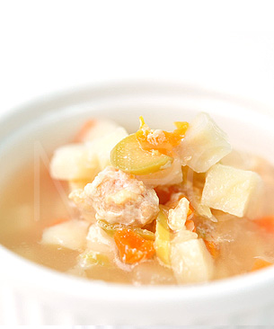 ジャガイモ、ニンジンなど5種の野菜と鶏肉を鶏ガラスープで煮込みました。