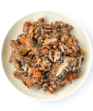 60%のターキー生肉と、30%の生のキビナゴ、10%の生野菜といったシンプルな原材料。