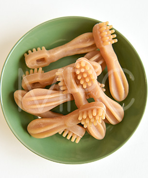 適度な硬さと独特な形状で、しっかり長時間噛むことができ歯垢の沈着を抑えます。人工着色料、香料、合成保存料不使用のデンタルケアおやつ。